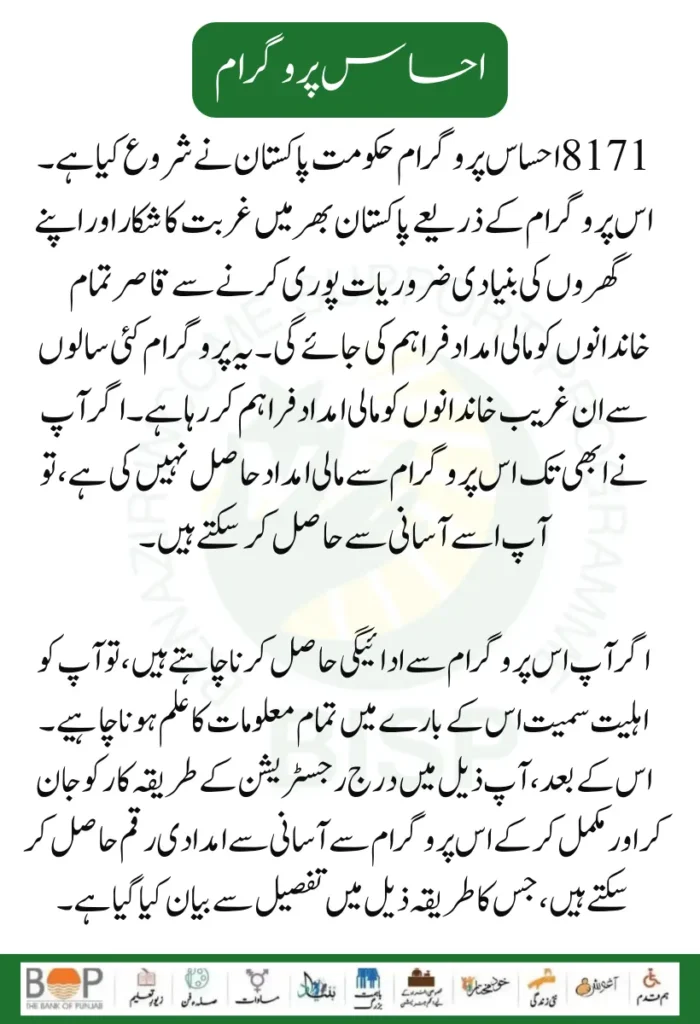 8171 You have to complete the registration procedure to get the assistance money given by the government of Pakistan through the Ehsaas programme. After completing the registration procedure, you can easily get the payment from this program. So you have been provided below the complete registration procedure in detail, which is as follows.