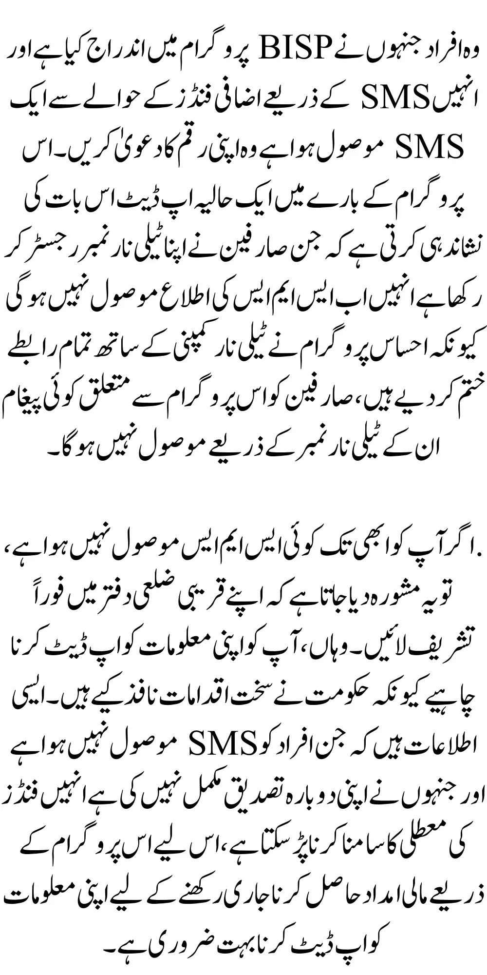 Individuals who are enrolled in the BISP program and have received an SMS regarding additional funds through SMS should claim their amount. A recent update about this program indicates that those users who have registered their Telenor numbers will no longer receive SMS notifications