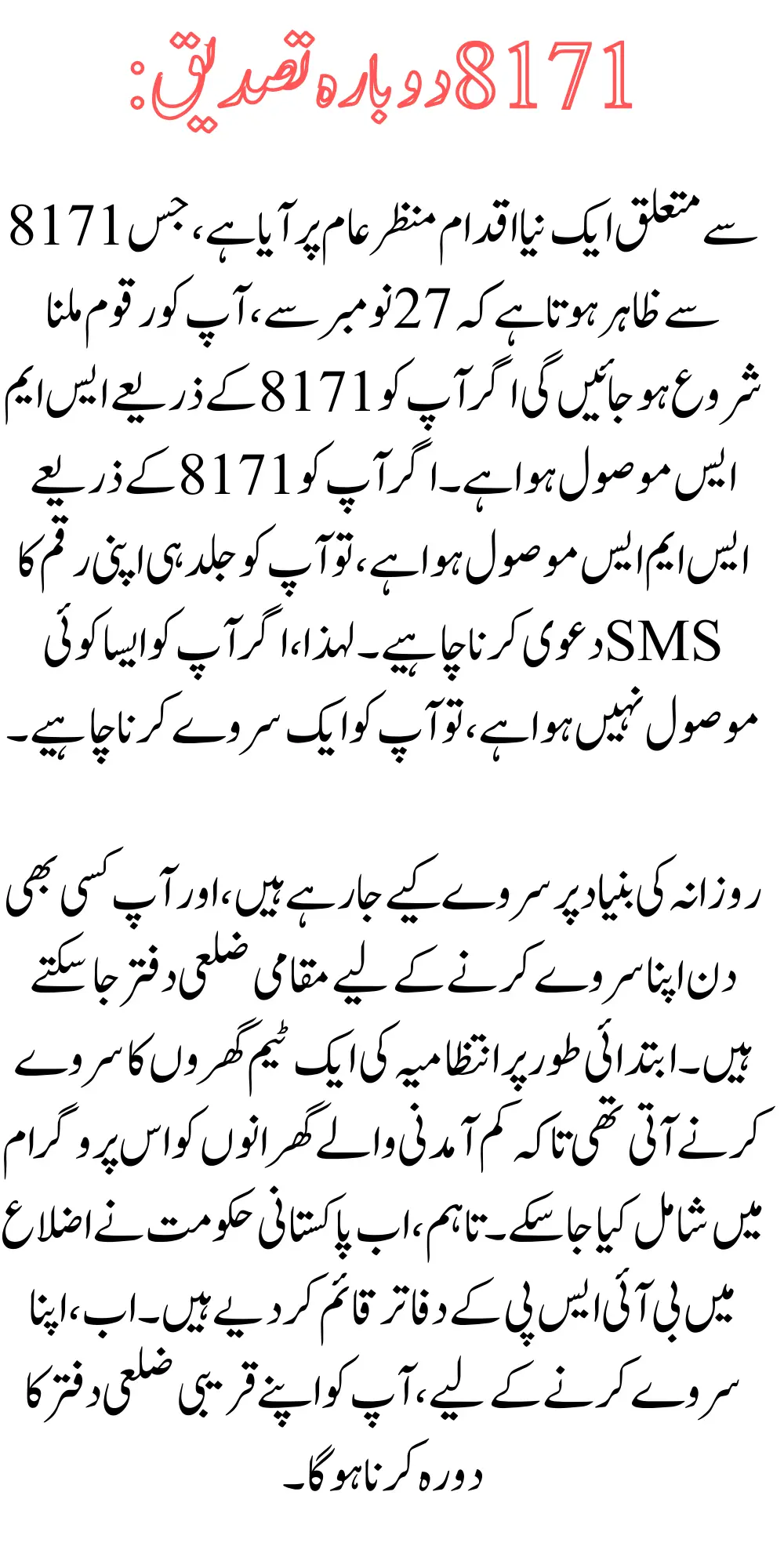If you have received an SMS, you should promptly claim your amount however, if you have not received any SMS from 8171, you should visit your nearby office there, you can complete your Ehsaas survey, after which you will be registered in the program Three months later, you can start receiving the monthly amount through this program.