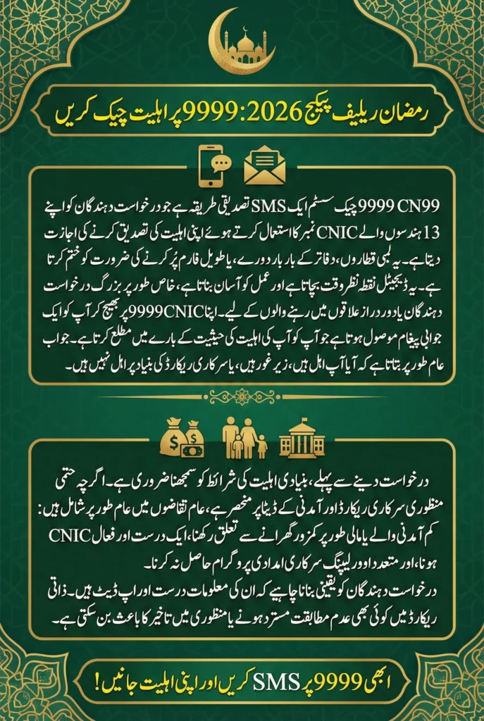 9999 CNIC check for Ramzan Relief Package 2026 offers a straightforward and practical way to confirm eligibility for financial assistance during Ramzan. By simply sending your CNIC number to 9999, you can find out whether you qualify and take the next steps if needed.