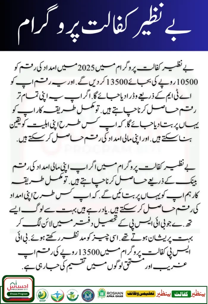 In the Benazir Kafaalat Program, the amount of assistance will be increased to 13500 rupees in 2025 instead of 10500 rupees. This amount will be withdrawn to you through an ATM. If you want to get all this money. Then the complete procedure will be told to you here. How you can make sure of your eligibility. And get your financial assistance amount. In the Benazir Kafalat Program, if you want to get your financial assistance amount through the bank.