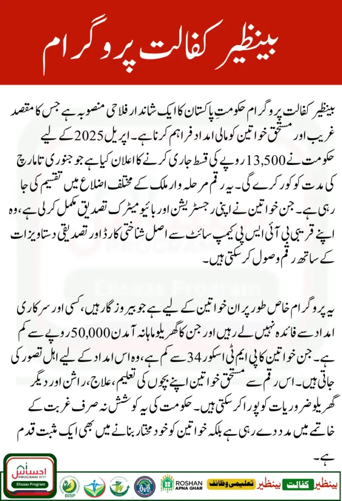 In April 2025, the Government of Pakistan has announced the release of a Rs. 13,500 installment for beneficiaries covering the January to March 2025 quarter. Payments are now being distributed across various districts in phases. This latest update brings much-needed relief to thousands of deserving families across the nation.