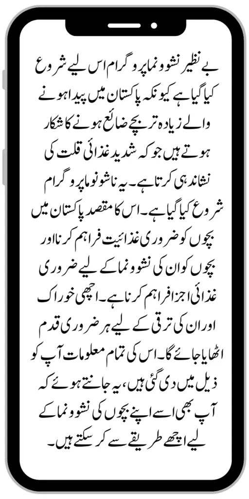 The Benazir Nashonuma Program has been initiated because most of the children born in Pakistan are prone to wasting, which indicates severe malnutrition. This Nashonuma program has been started. The aim is to provide the necessary nutrition to the children in Pakistan and to provide the children with the necessary nutrients for their development.
