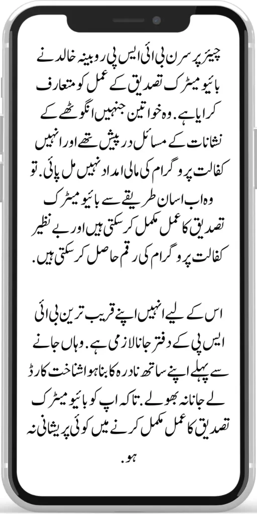 Chairperson BISP Rubina Khalid has introduced biometric authentication. Women who had problems with fingerprints and could not get financial assistance from the Kafaalat program can now easily complete the biometric verification process and receive money from the Benazir Kafaalat program.