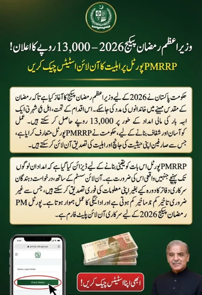 The Government of Pakistan has launched the PMRRP Portal 2026 PM Ramzan Package for 2026 to support families during the holy month of Ramzan. Under this initiative, eligible citizens can receive Rs. 13,000 as one-time financial assistance. To make the process convenient and transparent, the government has introduced the PMRRP Portal, allowing users to check their status and confirm eligibility online.